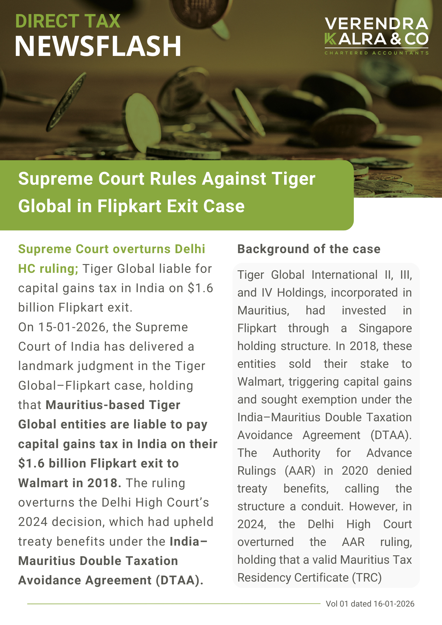 The News Flash Select 2026 2025 2024 2023 2022 2021 2020 2019 2018 2017 2016 2015 2014 --Select-- Direct Tax Indirect Tax Corporate Law FCRA FEMA Subject Matter Regulatory Domain Download Supreme Court Rules Against Tiger Global in Flipkart Exit Case January 17, 2026 Direct Tax Relaxation of additional fees and extension of time for filing of Financial Statements and Annual Returns under the Companies Act, 2013 January 01, 2026 Corporate Law