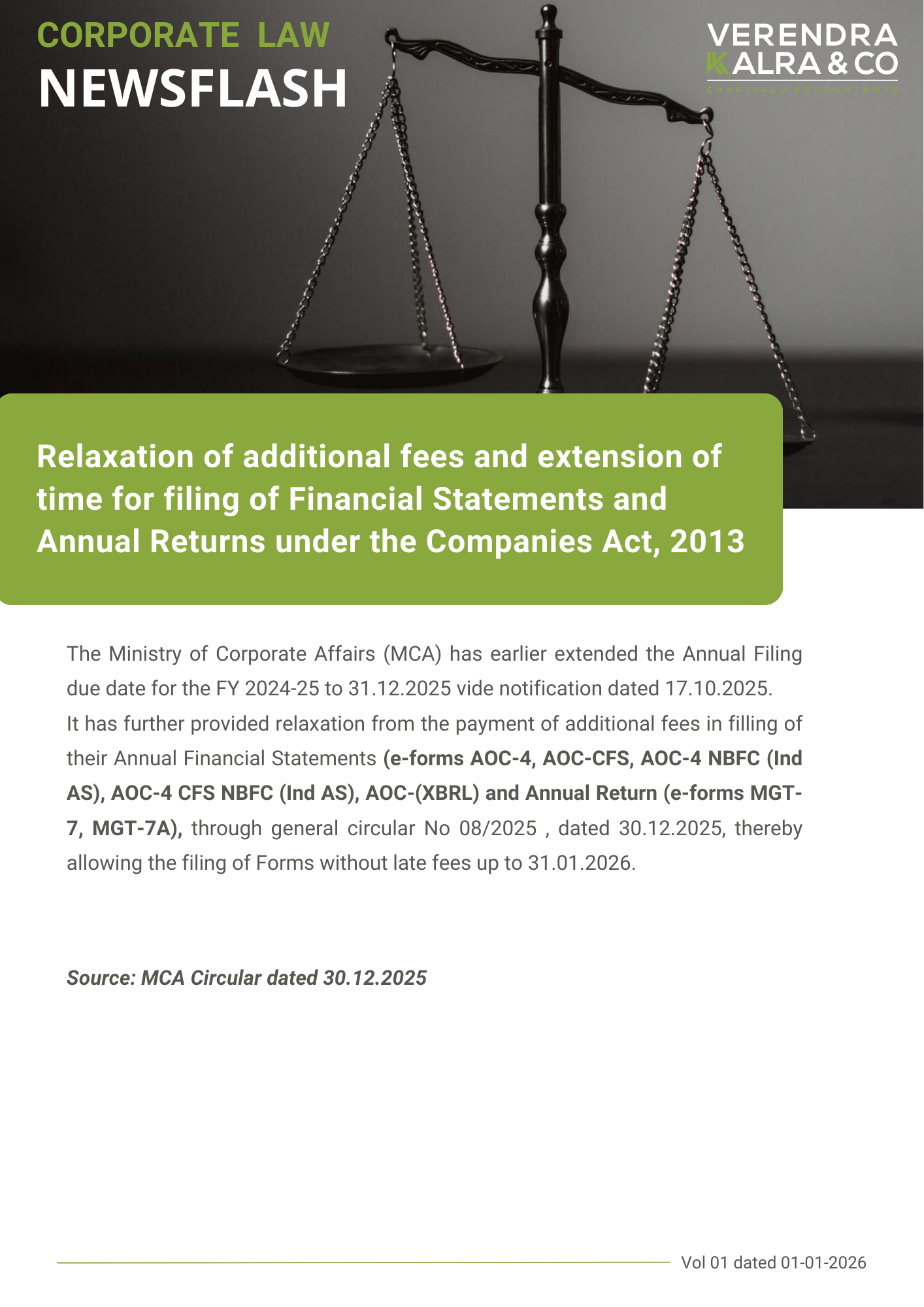 The News Flash Select 2026 2025 2024 2023 2022 2021 2020 2019 2018 2017 2016 2015 2014 --Select-- Direct Tax Indirect Tax Corporate Law FCRA FEMA Subject Matter Regulatory Domain Download Supreme Court Rules Against Tiger Global in Flipkart Exit Case January 17, 2026 Direct Tax Relaxation of additional fees and extension of time for filing of Financial Statements and Annual Returns under the Companies Act, 2013 January 01, 2026 Corporate Law