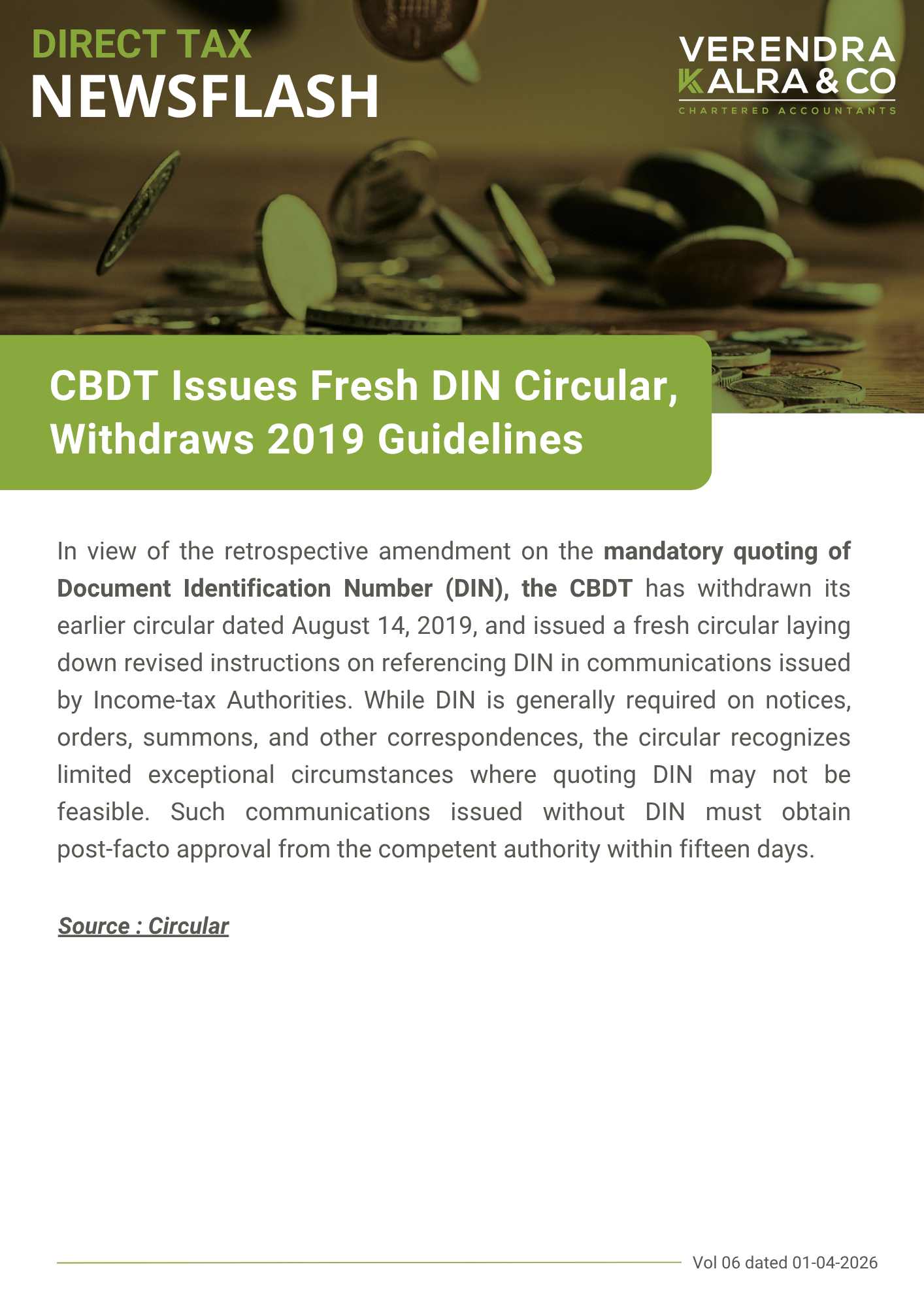 The News Flash Select 2026 2025 2024 2023 2022 2021 2020 2019 2018 2017 2016 2015 2014 --Select-- Direct Tax Indirect Tax Corporate Law FCRA FEMA Subject Matter Regulatory Domain Download CBDT Issues Fresh DIN Circular, Withdraws 2019 Guidelines April 01, 2026 Direct Tax CBDT Guidelines on UIN and Form 121 Compliance March 31, 2026 Direct Tax Extension of timeline for issuance of TDS Certificate for the quarter ending 31.12.2025 March 27, 2026 Direct Tax Lok Sabha passes Finance Bill, 2026 with amendments March 26, 2026 Direct Tax CBDT issues Form wise FAQs & Guidance notes for new Income tax Rules, 2026 March 23, 2026 Direct Tax Supreme Court Rules Against Tiger Global in Flipkart Exit Case January 17, 2026 Direct Tax