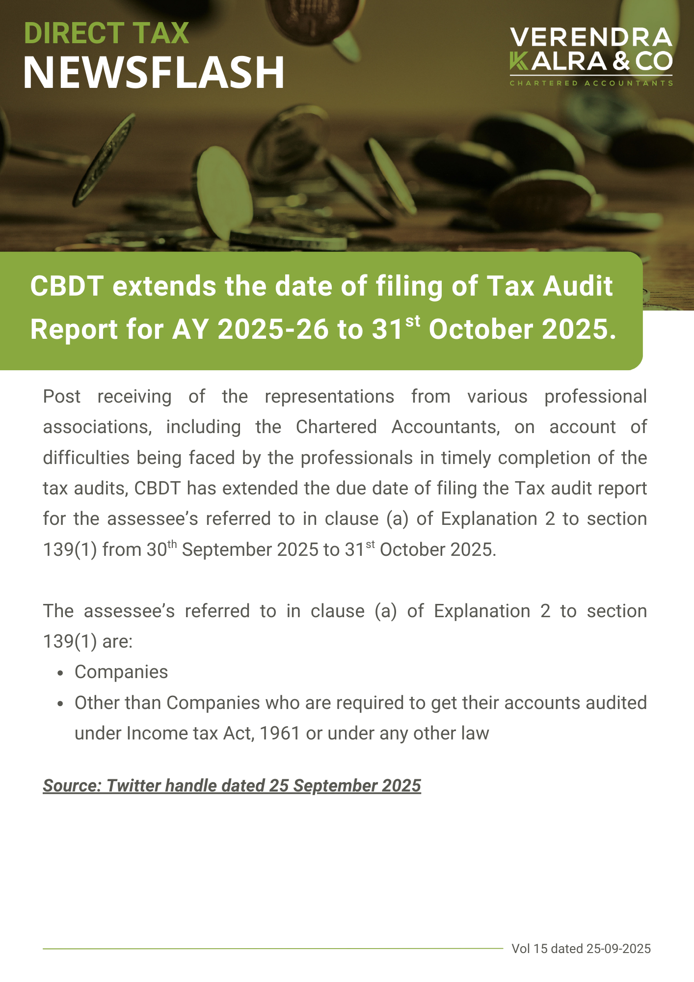 CBDT extends the date of filing of Tax Audit Report for AY 2025-26 to 31st October 2025 September 25, 2025