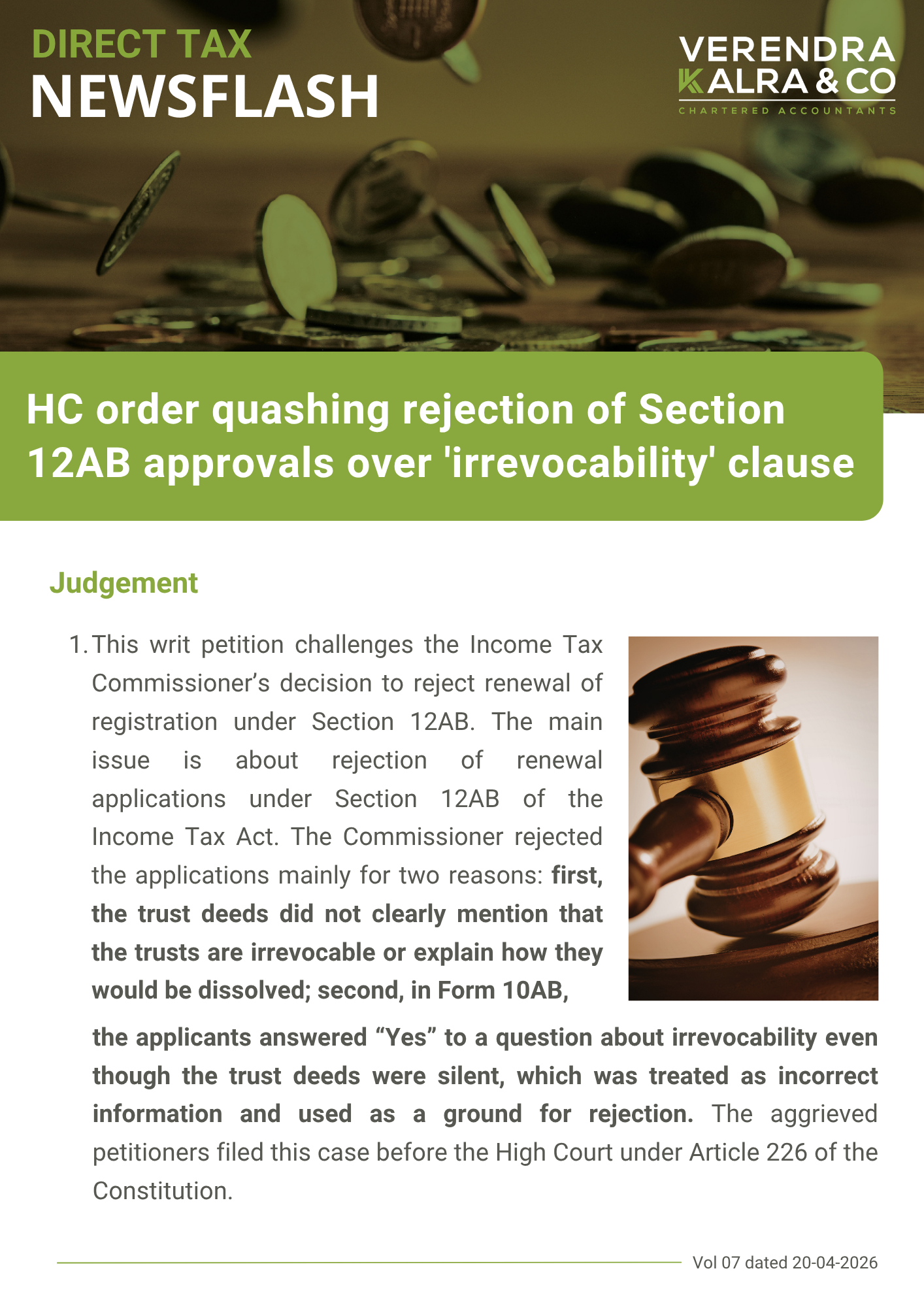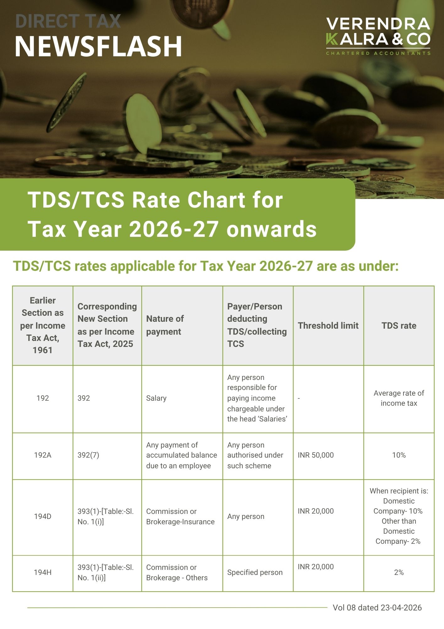 The News Flash Select 2026 2025 2024 2023 2022 2021 2020 2019 2018 2017 2016 2015 2014 --Select-- Direct Tax Indirect Tax Corporate Law FCRA FEMA Subject Matter Regulatory Domain Download TDS/TCS Rate Chart for F.Y. 2026-27 onwards April 23, 2026 Direct Tax HC order quashing rejection of Section 12AB approvals over irrevocability clause April 21, 2026 Direct Tax CBDT Issues Fresh DIN Circular, Withdraws 2019 Guidelines April 01, 2026 Direct Tax CBDT Guidelines on UIN and Form 121 Compliance March 31, 2026 Direct Tax Extension of timeline for issuance of TDS Certificate for the quarter ending 31.12.2025 March 27, 2026 Direct Tax Lok Sabha passes Finance Bill, 2026 with amendments March 26, 2026 Direct Tax CBDT issues Form wise FAQs & Guidance notes for new Income tax Rules, 2026 March 23, 2026 Direct Tax Supreme Court Rules Against Tiger Global in Flipkart Exit Case January 17, 2026 Direct Tax
