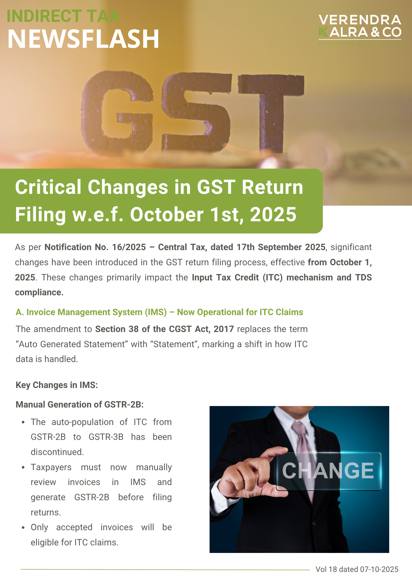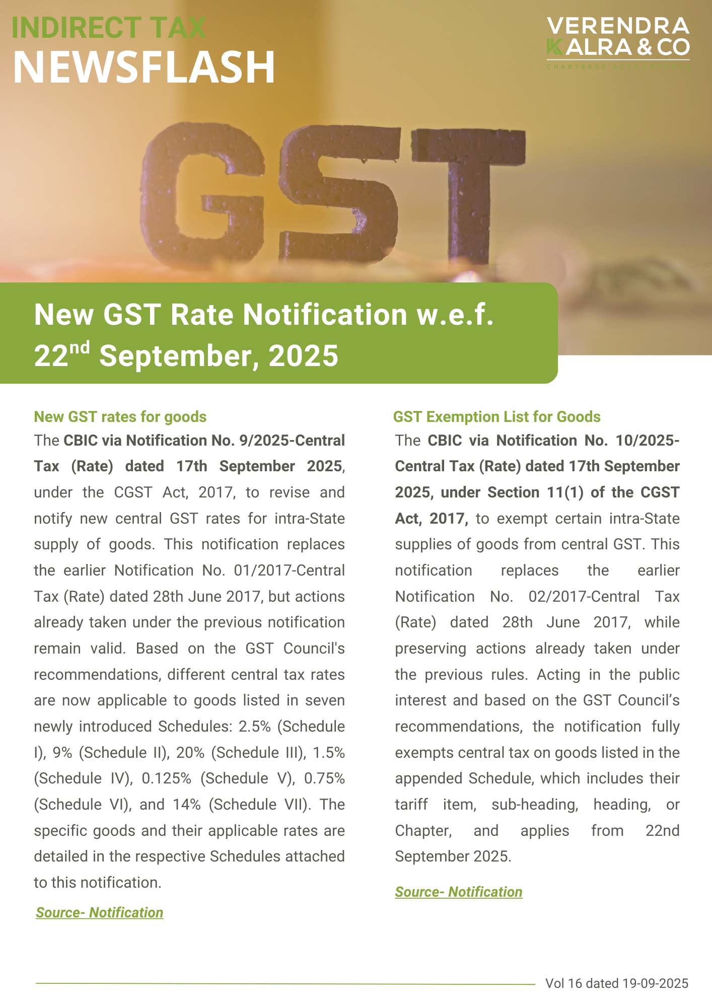 The News Flash Select 2025 2024 2023 2022 2021 2020 2019 2018 2017 2016 2015 2014 --Select-- Direct Tax Indirect Tax Corporate Law FCRA Subject Matter Regulatory Domain Download Critical Changes in GST Return Filing w.e.f. October 1st, 2025 October 07, 2025 Indirect Tax Changes in GST Rates post 56th GST Council Meeting September 20, 2025 Indirect Tax New GST Rate Notification w.e.f. 22nd September, 2025 September 19, 2025 Indirect Tax Highlights from the 56 GST Council Meeting (3 September 2025) September 06, 2025 Indirect Tax Key changes under GST w.e.f July 1, 2025 July 25, 2025 Indirect Tax Important Advisory on GST Returns June 09, 2025 Indirect Tax GST Appellate Tribunal (Procedure) Rules, 2025 April 28, 2025 Indirect Tax Major Changes in GST from April 1st, 2025 April 04, 2025 Indirect Tax Big Change in Hotel GST Rules: ‘Specified Premises’ Now Based on Actual Charges, Not Declared Tariff!" March 31, 2025 Indirect Tax Advisory on GST Waiver Application & Payment Issues March 22, 2025 Indirect Tax Mandatory ISD registration from April 1, 2025 March 21, 2025 Indirect Tax Mandatory ISD registration from 1st April 2025 - Act now to stay GST compliant March 06, 2025 Indirect Tax Deadline to avail Composition Scheme under GST February 27, 2025 Indirect Tax Deadline for filing Letter of Undertaking February 27, 2025 Indirect Tax Important Notifications issued by CBIC January 30, 2025 Indirect Tax Important Notification issued by CBIC January 30, 2025 Indirect Tax Important Circulars issued by CBIC January 30, 2025 Indirect Tax Important advisories issued by GSTN January 29, 2025 Indirect Tax Big Changes in GST filing applicable January 2025 onwards January 07, 2025 Indirect Tax Various GST Clarifications issued by Circulars January 03, 2025 Indirect Tax CBDT extends due date for determining amount payable in Sec. 90 of VsV Scheme, 2024 January 02, 2025 Indirect Tax