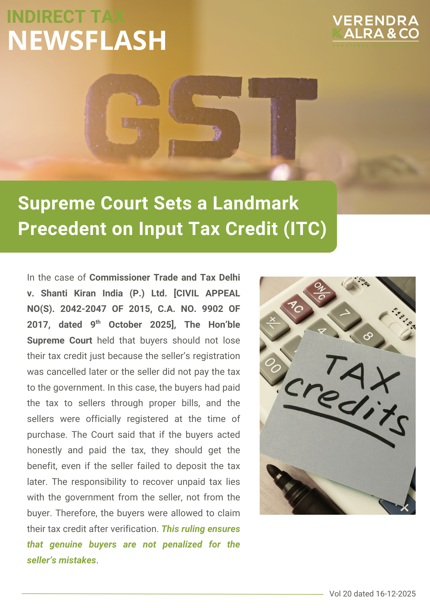 The News Flash Select 2025 2024 2023 2022 2021 2020 2019 2018 2017 2016 2015 2014 --Select-- Direct Tax Indirect Tax Corporate Law FCRA FEMA Subject Matter Regulatory Domain Download Supreme Court Sets a Landmark Precedent on Input Tax Credit (ITC) December 16, 2025 Indirect Tax GSTR- 3B Due Date Extension for the month of September 2025 October 18, 2025 Indirect Tax Critical Changes in GST Return Filing w.e.f. October 1st, 2025 October 07, 2025 Indirect Tax Changes in GST Rates post 56th GST Council Meeting September 20, 2025 Indirect Tax New GST Rate Notification w.e.f. 22nd September, 2025 September 19, 2025 Indirect Tax Highlights from the 56 GST Council Meeting (3 September 2025) September 06, 2025 Indirect Tax Key changes under GST w.e.f July 1, 2025 July 25, 2025 Indirect Tax Important Advisory on GST Returns June 09, 2025 Indirect Tax GST Appellate Tribunal (Procedure) Rules, 2025 April 28, 2025 Indirect Tax Major Changes in GST from April 1st, 2025 April 04, 2025 Indirect Tax Big Change in Hotel GST Rules: ‘Specified Premises’ Now Based on Actual Charges, Not Declared Tariff!" March 31, 2025 Indirect Tax Advisory on GST Waiver Application & Payment Issues March 22, 2025 Indirect Tax Mandatory ISD registration from April 1, 2025 March 21, 2025 Indirect Tax Mandatory ISD registration from 1st April 2025 - Act now to stay GST compliant March 06, 2025 Indirect Tax Deadline to avail Composition Scheme under GST February 27, 2025 Indirect Tax Deadline for filing Letter of Undertaking February 27, 2025 Indirect Tax Important Notifications issued by CBIC January 30, 2025 Indirect Tax Important Notification issued by CBIC January 30, 2025 Indirect Tax Important Circulars issued by CBIC January 30, 2025 Indirect Tax Important advisories issued by GSTN January 29, 2025 Indirect Tax Big Changes in GST filing applicable January 2025 onwards January 07, 2025 Indirect Tax Various GST Clarifications issued by Circulars January 03, 2025 Indirect Tax CBDT extends due date for determining amount payable in Sec. 90 of VsV Scheme, 2024 January 02, 2025 Indirect Tax